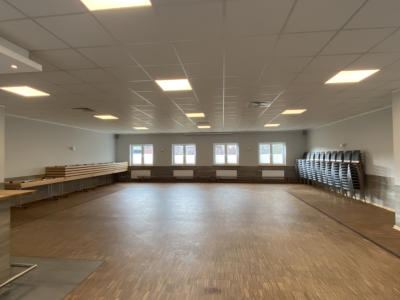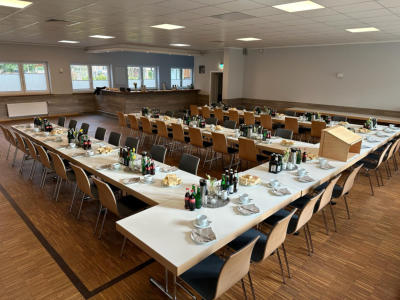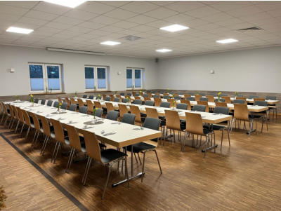 Saal mit Tische und Stühle. Diese können vom Nutzer frei aufgestellt werden.